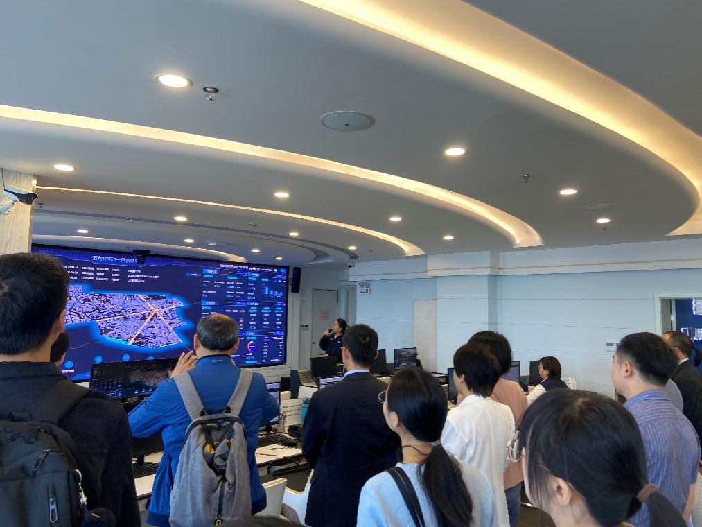 师生党员一行首先抵达了五角场街道城运中心。在街道党工委副书记、办事处主任陈柏霖和党工委副书记邵晓燕的带领下,师生党员有序进入街道城运中心指挥室。在这里,中心讲解员郭艳详细介绍了数字化时代五角场街道在基层治理方面的探索与实践。通过现场演示和讲解,党员们对如何利用现代科技手段提升城市治理效能有了更为直观的认识和理解。