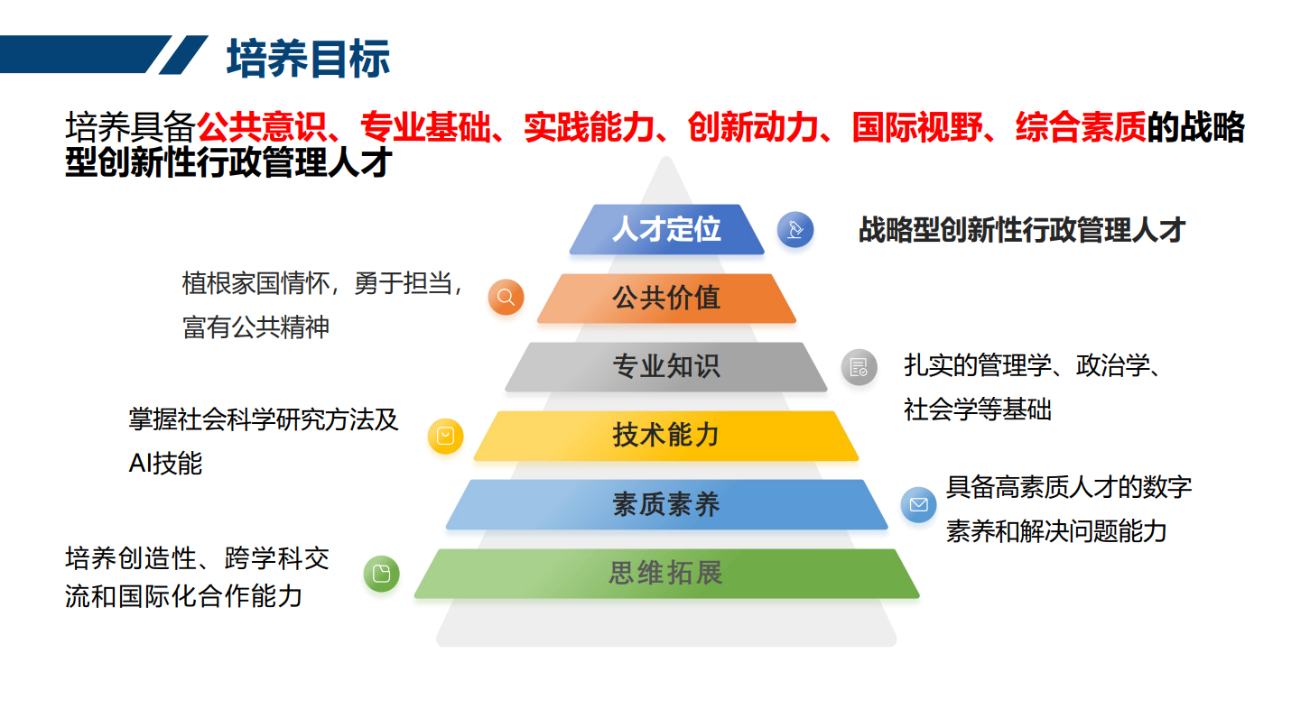面向国家发展新质生产力战略部署,适应数智时代“人工智能+政府治理”(AI for Governance,AI4G)的发展趋势,PA直营官网行政管理专业致力于培养“公共意识强、专业基础实、实践能力优、创新动力足、国际视野显、综合素质高”的战略型创新性行政管理卓越人才,着力促进学生德、智、体、美、劳全面发展,使学生掌握现代行政管理理论和知识、前沿研究方法和分析工具,善于运用学科基础理论、前沿知识和创新性思维方式为国家治理体系和治理能力现代化赋能增智,毕业生具备在党政机关、事业单位、社会组织等公共部门从事公共管理和公共服务相关工作的高素质劳动者能力。