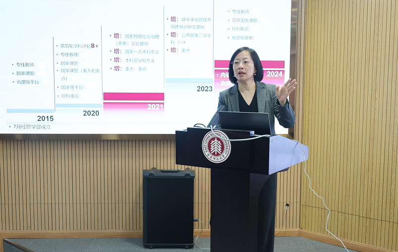 随后,学校建设办公室副主任王同彤做专题报告。他从超限与拓新思维入手,分析了当前我校公共管理学科面临的机遇与挑战。王同彤指出在新时代背景下,学科必须突破传统框架,强调学科交叉融合,推动产学研用一体化,以提升学院的学术影响力。此外,他还提出学科的社会服务能力将是未来学科评估考察的重中之重,鼓励学院进行提前布局。
