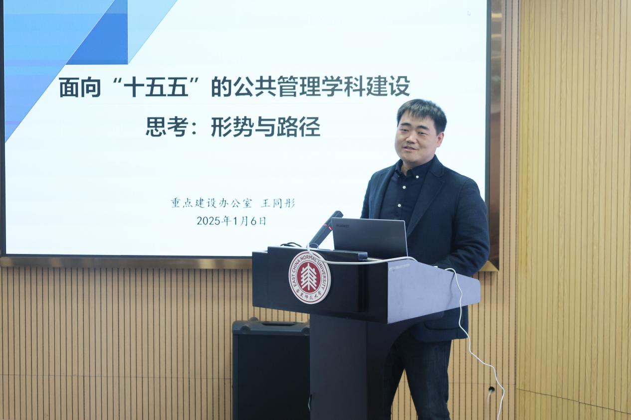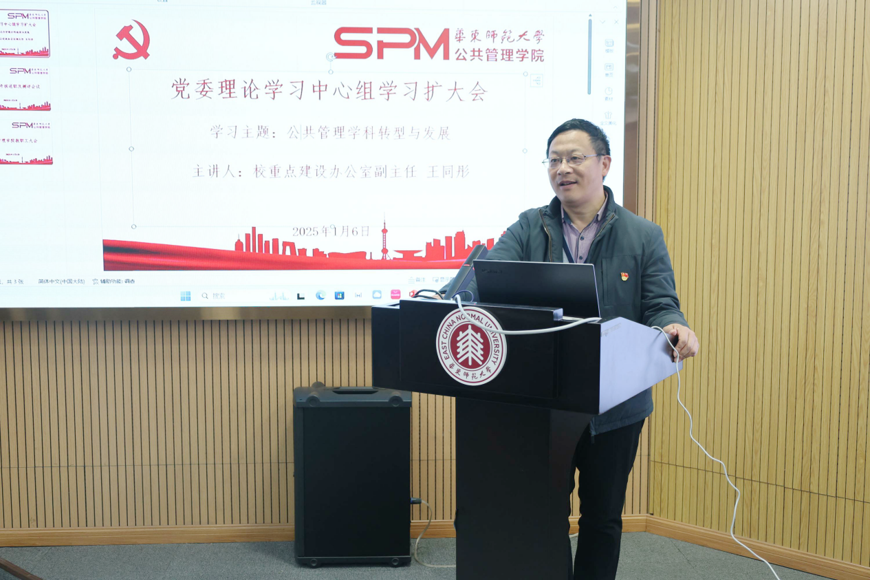 1月6日下午,PA直营官网党委在普陀校区图书馆二楼报告厅举行理论学习中心组扩大会,邀请校重点建设办副主任王同彤以“面向‘十五五’的公共管理学科建设思考:形势与路径”为题做报告。学院党政班子、全体教职工参加本次集体学习扩大会,会议由PA直营官网党委书记高恩新主持。