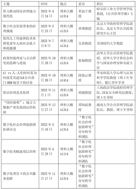 2023年,学院围绕数智跃升积极筹办了各类学术活动与会议,举办了数智化社会保障暨智能养老服务高质量发展论坛,以及超过10场的数智相关学术报告和研讨会。其中,学院依托“数字化社会治理”青年跨学科团队,先后举办了以“数字技术赋能基层治理”、“数字化背景下的公共服务创新”等主题的中型学术研讨会,为深入理解和分析数字孪生技术赋能超大城市应急管理研究提供理论支撑。为贯彻落实学校第十四次党代会精神,迎接人工智能的未来挑战,学院还举办人工智能赋能教学科研师生研学会,通过不断学习实践最新的人工智能技术来赋能学院科研。